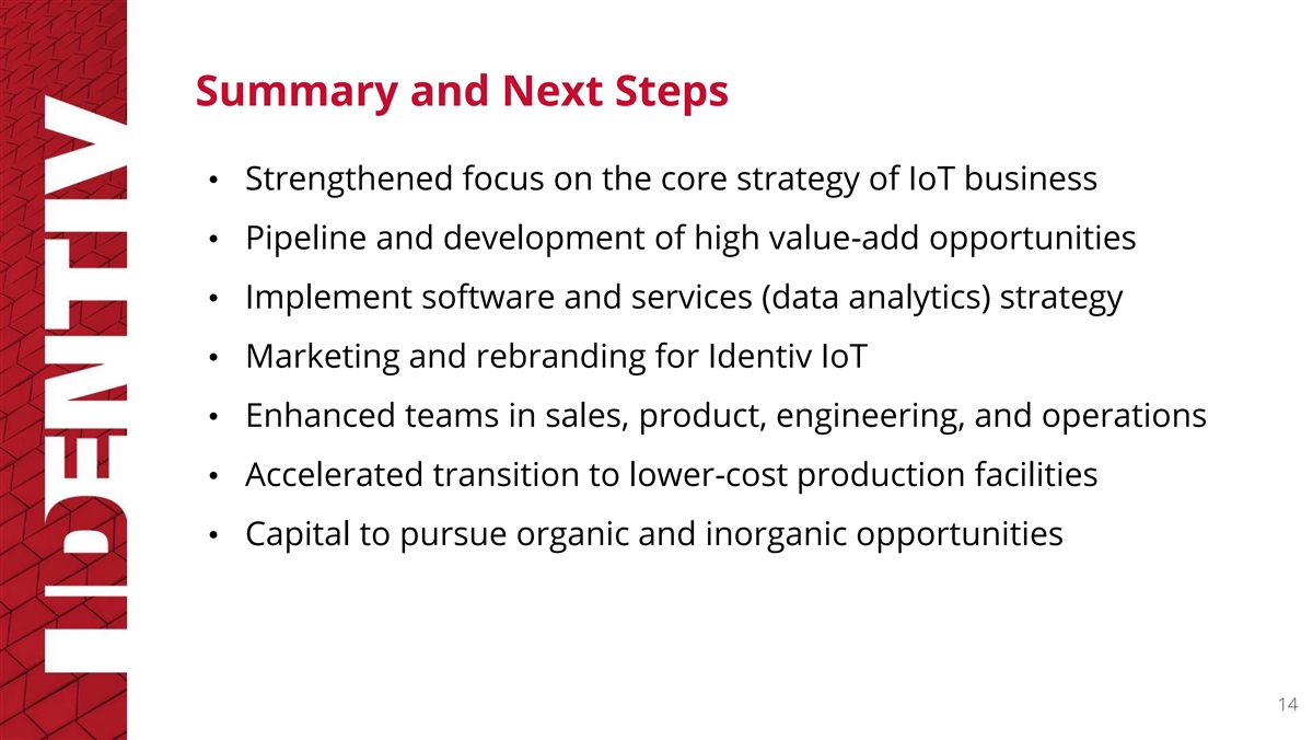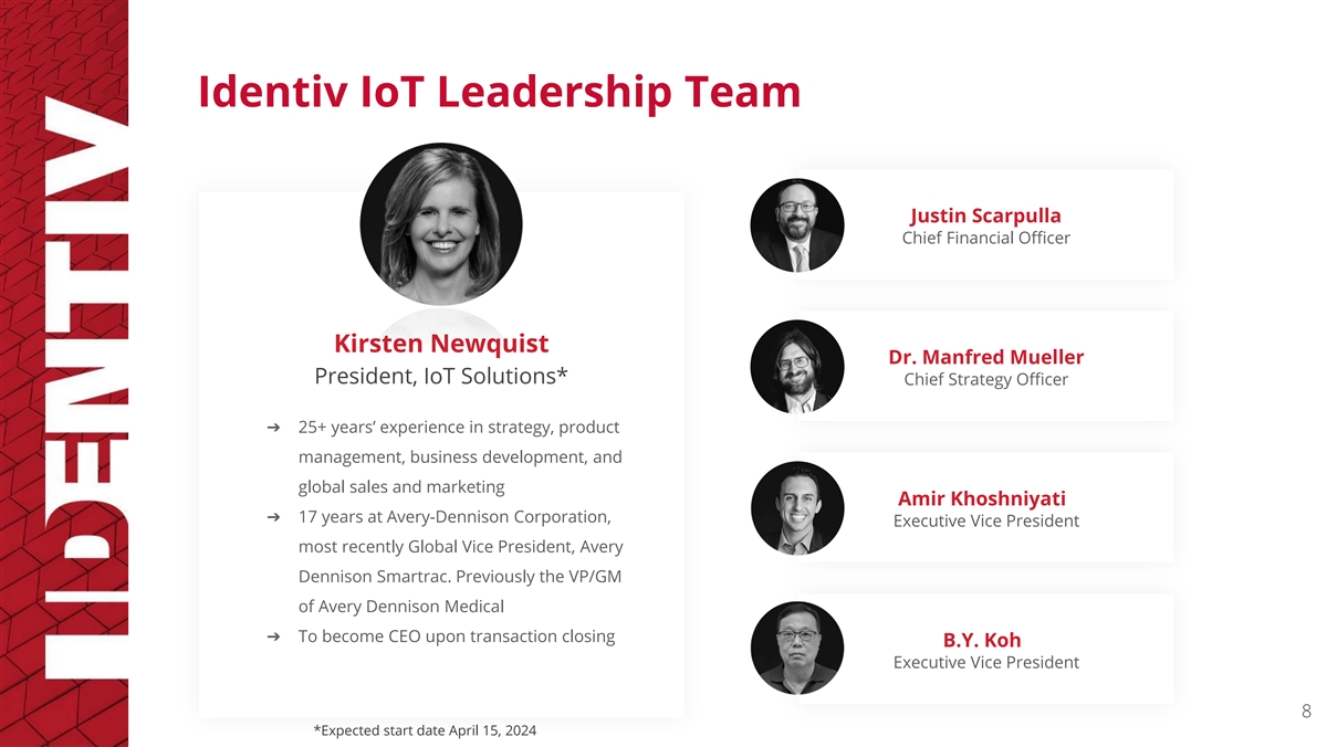 Aligned with this strategic direction, Identiv announced the appointment of Kirsten Newquist as President, IoT Solutions, effective April 15, 2024. Ms. Newquist is a seasoned business leader with over 25 years’ experience in strategy, product management, business development, and global sales and marketing. She will join Identiv after 17 years at Avery Dennison Corporation. She was most recently Global Vice President, Avery Dennison Smartrac, and previously held other leadership roles including the VP/GM of Avery Dennison Medical.