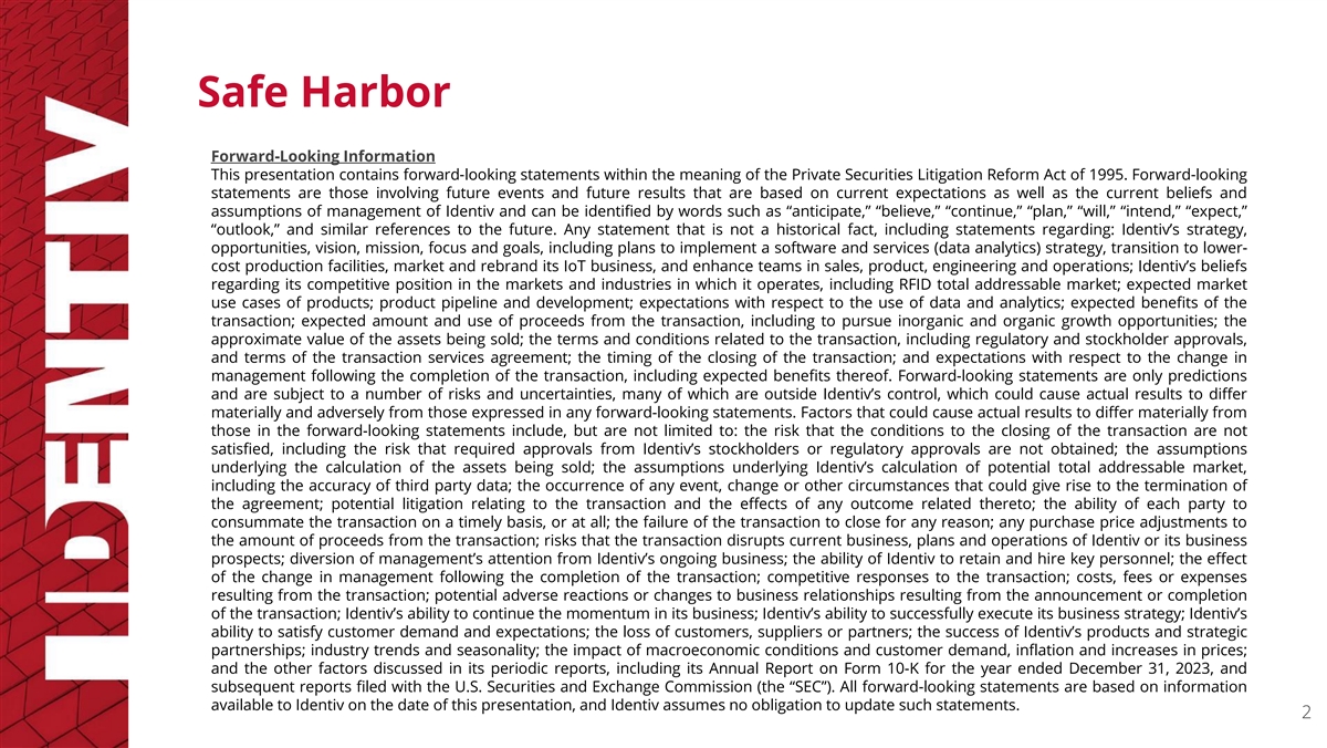 Safe Harbor Forward-Looking Information This presentation contains forward-looking statements within the meaning of the Private Securities Litigation Reform Act of 1995. Forward-looking statements are those involving future events and future results that are based on current expectations as well as the current beliefs and assumptions of management of Identiv and can be identified by words such as “anticipate,” “believe,” “continue,” “plan,” “will,” “intend,” “expect,” “outlook,” and similar references to the future. Any statement that is not a historical fact, including statements regarding: Identiv’s strategy, opportunities, vision, mission, focus and goals, including plans to implement a software and services (data analytics) strategy, transition to lower- cost production facilities, market and rebrand its IoT business, and enhance teams in sales, product, engineering and operations; Identiv’s beliefs regarding its competitive position in the markets and industries in which it operates, including RFID total addressable market; expected market use cases of products; product pipeline and development; expectations with respect to the use of data and analytics; expected benefits of the transaction; expected amount and use of proceeds from the transaction, including to pursue inorganic and organic growth opportunities; the approximate value of the assets being sold; the terms and conditions related to the transaction, including regulatory and stockholder approvals, and terms of the transaction services agreement; the timing of the closing of the transaction; and expectations with respect to the change in management following the completion of the transaction, including expected benefits thereof. Forward-looking statements are only predictions and are subject to a number of risks and uncertainties, many of which are outside Identiv’s control, which could cause actual results to differ materially and adversely from those expressed in any forward-looking statements. Factors that could cause actual results to differ materially from those in the forward-looking statements include, but are not limited to: the risk that the conditions to the closing of the transaction are not satisfied, including the risk that required approvals from Identiv’s stockholders or regulatory approvals are not obtained; the assumptions underlying the calculation of the assets being sold; the assumptions underlying Identiv’s calculation of potential total addressable market, including the accuracy of third party data; the occurrence of any event, change or other circumstances that could give rise to the termination of the agreement; potential litigation relating to the transaction and the effects of any outcome related thereto; the ability of each party to consummate the transaction on a timely basis, or at all; the failure of the transaction to close for any reason; any purchase price adjustments to the amount of proceeds from the transaction; risks that the transaction disrupts current business, plans and operations of Identiv or its business prospects; diversion of management’s attention from Identiv’s ongoing business; the ability of Identiv to retain and hire key personnel; the effect of the change in management following the completion of the transaction; competitive responses to the transaction; costs, fees or expenses resulting from the transaction; potential adverse reactions or changes to business relationships resulting from the announcement or completion of the transaction; Identiv’s ability to continue the momentum in its business; Identiv’s ability to successfully execute its business strategy; Identiv’s ability to satisfy customer demand and expectations; the loss of customers, suppliers or partners; the success of Identiv’s products and strategic partnerships; industry trends and seasonality; the impact of macroeconomic conditions and customer demand, inflation and increases in prices; and the other factors discussed in its periodic reports, including its Annual Report on Form 10-K for the year ended December 31, 2023, and subsequent reports filed with the U.S. Securities and Exchange Commission (the “SEC”). All forward-looking statements are based on information available to Identiv on the date of this presentation, and Identiv assumes no obligation to update such statements. 2
