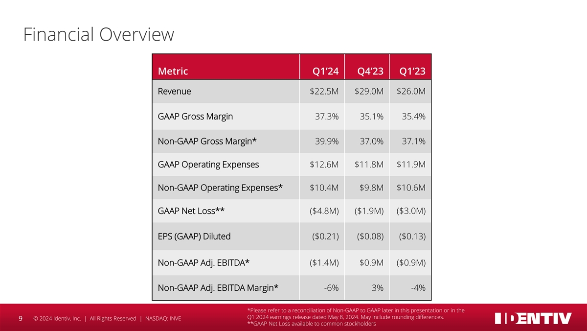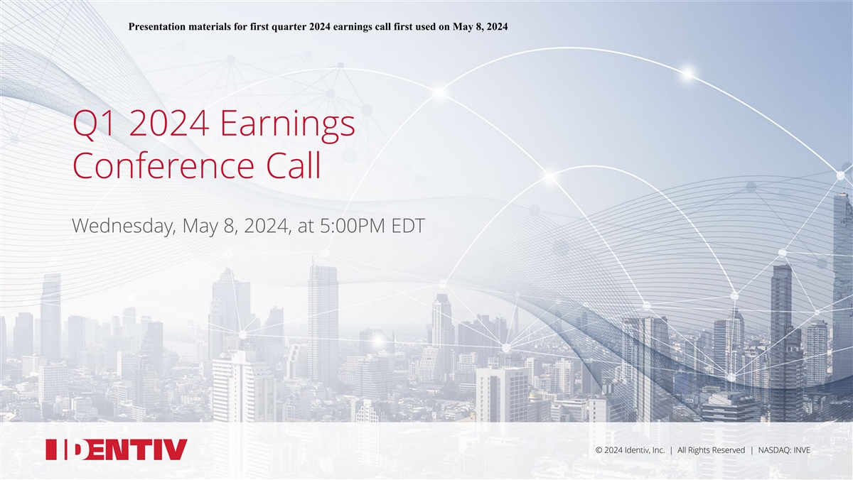 Presentation materials for first quarter 2024 earnings call first used on May 8, 2024 Q1 2024 Earnings Conference Call Wednesday, May 8, 2024, at 5:00PM EDT © 2024 Identiv, Inc. | All Rights Reserved | NASDAQ: INVE