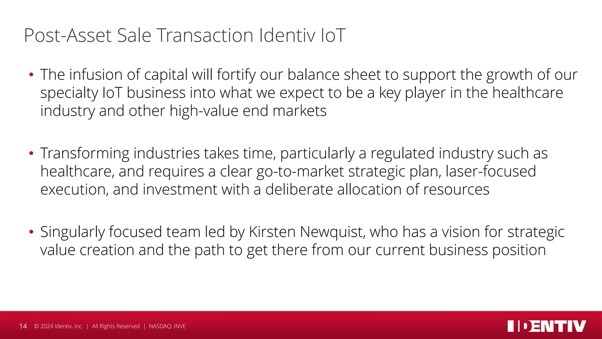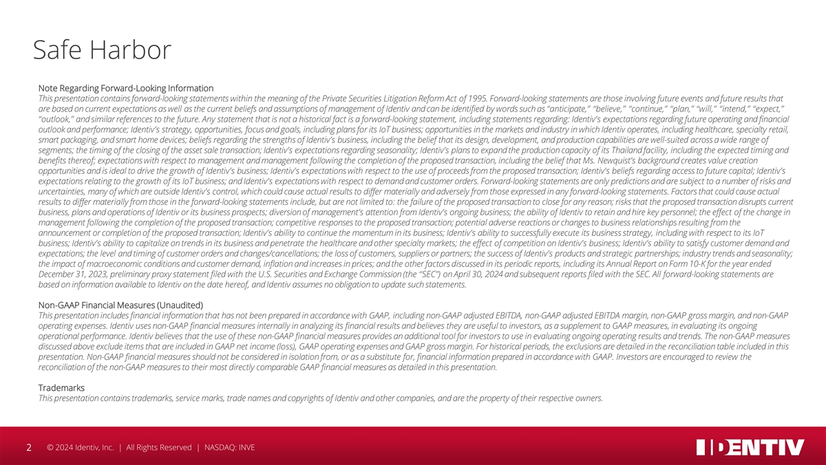 Safe Harbor Note Regarding Forward-Looking Information This presentation contains forward-looking statements within the meaning of the Private Securities Litigation Reform Act of 1995. Forward-looking statements are those involving future events and future results that are based on current expectations as well as the current beliefs and assumptions of management of Identiv and can be identified by words such as “anticipate,” “believe,” “continue,” “plan,” “will,” “intend,” “expect,” “outlook,” and similar references to the future. Any statement that is not a historical fact is a forward-looking statement, including statements regarding: Identiv’s expectations regarding future operating and financial outlook and performance; Identiv’s strategy, opportunities, focus and goals, including plans for its IoT business; opportunities in the markets and industry in which Identiv operates, including healthcare, specialty retail, smart packaging, and smart home devices; beliefs regarding the strengths of Identiv’s business, including the belief that its design, development, and production capabilities are well-suited across a wide range of segments; the timing of the closing of the asset sale transaction; Identiv’s expectations regarding seasonality; Identiv’s plans to expand the production capacity of its Thailand facility, including the expected timing and benefits thereof; expectations with respect to management and management following the completion of the proposed transaction, including the belief that Ms. Newquist’s background creates value creation opportunities and is ideal to drive the growth of Identiv’s business; Identiv’s expectations with respect to the use of proceeds from the proposed transaction; Identiv’s beliefs regarding access to future capital; Identiv’s expectations relating to the growth of its IoT business; and Identiv’s expectations with respect to demand and customer orders. Forward-looking statements are only predictions and are subject to a number of risks and uncertainties, many of which are outside Identiv’s control, which could cause actual results to differ materially and adversely from those expressed in any forward-looking statements. Factors that could cause actual results to differ materially from those in the forward-looking statements include, but are not limited to: the failure of the proposed transaction to close for any reason; risks that the proposed transaction disrupts current business, plans and operations of Identiv or its business prospects; diversion of management’s attention from Identiv’s ongoing business; the ability of Identiv to retain and hire key personnel; the effect of the change in management following the completion of the proposed transaction; competitive responses to the proposed transaction; potential adverse reactions or changes to business relationships resulting from the announcement or completion of the proposed transaction; Identiv’s ability to continue the momentum in its business; Identiv’s ability to successfully execute its business strategy, including with respect to its IoT business; Identiv’s ability to capitalize on trends in its business and penetrate the healthcare and other specialty markets; the effect of competition on Identiv’s business; Identiv’s ability to satisfy customer demand and expectations; the level and timing of customer orders and changes/cancellations; the loss of customers, suppliers or partners; the success of Identiv’s products and strategic partnerships; industry trends and seasonality; the impact of macroeconomic conditions and customer demand, inflation and increases in prices; and the other factors discussed in its periodic reports, including its Annual Report on Form 10-K for the year ended December 31, 2023, preliminary proxy statement filed with the U.S. Securities and Exchange Commission (the “SEC”) on April 30, 2024 and subsequent reports filed with the SEC. All forward-looking statements are based on information available to Identiv on the date hereof, and Identiv assumes no obligation to update such statements. Non-GAAP Financial Measures (Unaudited) This presentation includes financial information that has not been prepared in accordance with GAAP, including non-GAAP adjusted EBITDA, non-GAAP adjusted EBITDA margin, non-GAAP gross margin, and non-GAAP operating expenses. Identiv uses non-GAAP financial measures internally in analyzing its financial results and believes they are useful to investors, as a supplement to GAAP measures, in evaluating its ongoing operational performance. Identiv believes that the use of these non-GAAP financial measures provides an additional tool for investors to use in evaluating ongoing operating results and trends. The non-GAAP measures discussed above exclude items that are included in GAAP net income (loss), GAAP operating expenses and GAAP gross margin. For historical periods, the exclusions are detailed in the reconciliation table included in this presentation. Non-GAAP financial measures should not be considered in isolation from, or as a substitute for, financial information prepared in accordance with GAAP. Investors are encouraged to review the reconciliation of the non-GAAP measures to their most directly comparable GAAP financial measures as detailed in this presentation. Trademarks This presentation contains trademarks, service marks, trade names and copyrights of Identiv and other companies, and are the property of their respective owners. © 2024 Identiv, Inc. | All Rights Reserved | NASDAQ: INVE 2