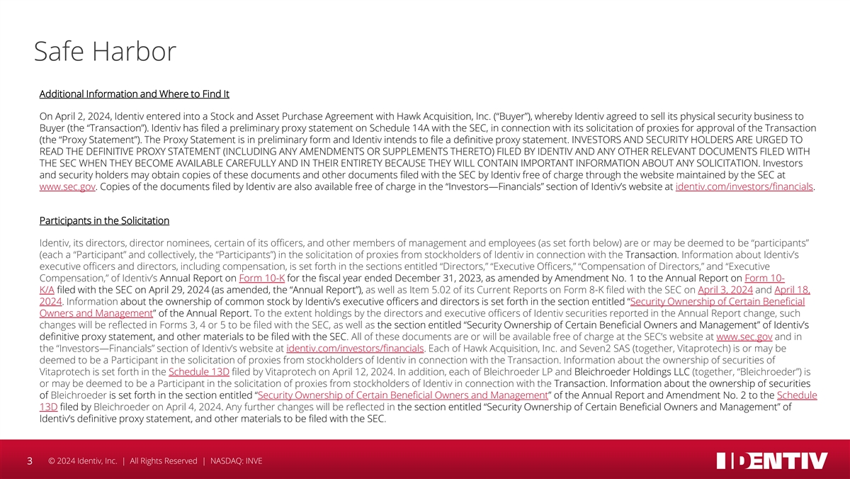 Safe Harbor Additional Information and Where to Find It On April 2, 2024, Identiv entered into a Stock and Asset Purchase Agreement with Hawk Acquisition, Inc. (“Buyer”), whereby Identiv agreed to sell its physical security business to Buyer (the “Transaction”). Identiv has filed a preliminary proxy statement on Schedule 14A with the SEC, in connection with its solicitation of proxies for approval of the Transaction (the “Proxy Statement”). The Proxy Statement is in preliminary form and Identiv intends to file a definitive proxy statement. INVESTORS AND SECURITY HOLDERS ARE URGED TO READ THE DEFINITIVE PROXY STATEMENT (INCLUDING ANY AMENDMENTS OR SUPPLEMENTS THERETO) FILED BY IDENTIV AND ANY OTHER RELEVANT DOCUMENTS FILED WITH THE SEC WHEN THEY BECOME AVAILABLE CAREFULLY AND IN THEIR ENTIRETY BECAUSE THEY WILL CONTAIN IMPORTANT INFORMATION ABOUT ANY SOLICITATION. Investors and security holders may obtain copies of these documents and other documents filed with the SEC by Identiv free of charge through the website maintained by the SEC at www.sec.gov. Copies of the documents filed by Identiv are also available free of charge in the “Investors—Financials” section of Identiv’s website at identiv.com/investors/financials. Participants in the Solicitation Identiv, its directors, director nominees, certain of its officers, and other members of management and employees (as set forth below) are or may be deemed to be “participants” (each a “Participant” and collectively, the “Participants”) in the solicitation of proxies from stockholders of Identiv in connection with the Transaction. Information about Identiv’s executive officers and directors, including compensation, is set forth in the sections entitled “Directors,” “Executive Officers,” “Compensation of Directors,” and “Executive Compensation,” of Identiv’s Annual Report on Form 10-K for the fiscal year ended December 31, 2023, as amended by Amendment No. 1 to the Annual Report on Form 10- K/A filed with the SEC on April 29, 2024 (as amended, the “Annual Report”), as well as Item 5.02 of its Current Reports on Form 8-K filed with the SEC on April 3, 2024 and April 18, 2024. Information about the ownership of common stock by Identiv’s executive officers and directors is set forth in the section entitled “Security Ownership of Certain Beneficial Owners and Management” of the Annual Report. To the extent holdings by the directors and executive officers of Identiv securities reported in the Annual Report change, such changes will be reflected in Forms 3, 4 or 5 to be filed with the SEC, as well as the section entitled “Security Ownership of Certain Beneficial Owners and Management” of Identiv’s definitive proxy statement, and other materials to be filed with the SEC. All of these documents are or will be available free of charge at the SEC’s website at www.sec.gov and in the “Investors—Financials” section of Identiv’s website at identiv.com/investors/financials. Each of Hawk Acquisition, Inc. and Seven2 SAS (together, Vitaprotech) is or may be deemed to be a Participant in the solicitation of proxies from stockholders of Identiv in connection with the Transaction. Information about the ownership of securities of Vitaprotech is set forth in the Schedule 13D filed by Vitaprotech on April 12, 2024. In addition, each of Bleichroeder LP and Bleichroeder Holdings LLC (together, “Bleichroeder”) is or may be deemed to be a Participant in the solicitation of proxies from stockholders of Identiv in connection with the Transaction. Information about the ownership of securities of Bleichroeder is set forth in the section entitled “Security Ownership of Certain Beneficial Owners and Management” of the Annual Report and Amendment No. 2 to the Schedule 13D filed by Bleichroeder on April 4, 2024. Any further changes will be reflected in the section entitled “Security Ownership of Certain Beneficial Owners and Management” of Identiv’s definitive proxy statement, and other materials to be filed with the SEC. © 2024 Identiv, Inc. | All Rights Reserved | NASDAQ: INVE 3