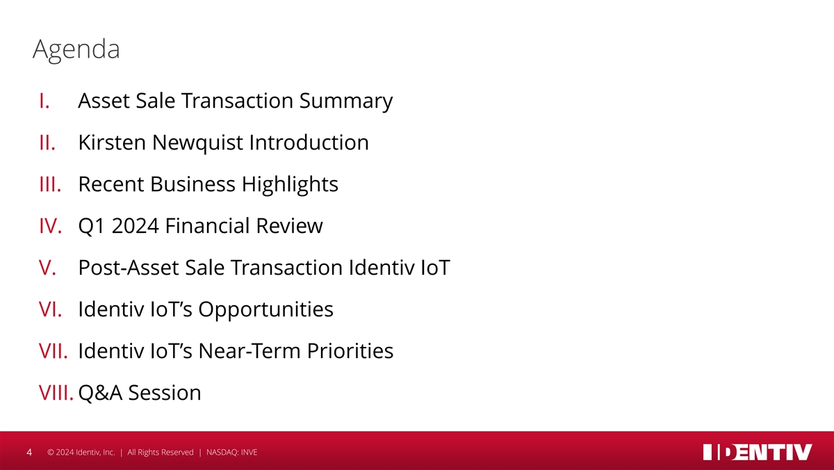 Actual results may differ materially from those expressed in these forward-looking statements. For more information, please refer to the risk factors discussed in documents filed from time to time with the SEC, including the company’s latest Annual Report on Form 10-K and Quarterly Report on Form 10-Q. In addition, risks related to the asset sale are included in the preliminary proxy statement filed with the SEC April30, 2024 and our first quarter 10-Q once filed, and will be included in the definitive proxy statement, once filed. Identiv assumes no obligation to update these forward-looking statements, which speak as of today.