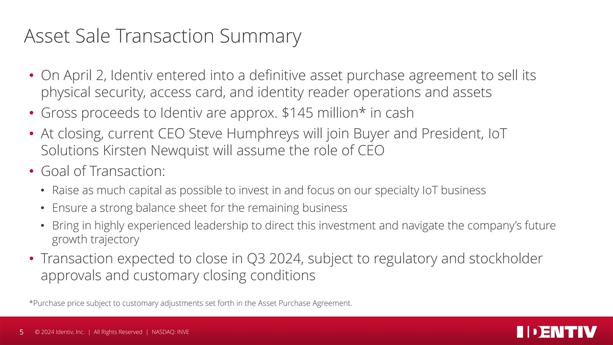 Agenda I. Asset Sale Transaction Summary II. Kirsten Newquist Introduction III. Recent Business Highlights IV. Q1 2024 Financial Review V. Post-Asset Sale Transaction Identiv IoT VI. Identiv IoT’s Opportunities VII. Identiv IoT’s Near-Term Priorities VIII. Q&A Session © 2024 Identiv, Inc. | All Rights Reserved | NASDAQ: INVE 4