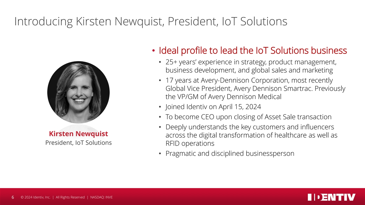 Asset Sale Transaction Summary • On April 2, Identiv entered into a definitive asset purchase agreement to sell its physical security, access card, and identity reader operations and assets • Gross proceeds to Identiv are approx. $145 million* in cash • At closing, current CEO Steve Humphreys will join Buyer and President, IoT Solutions Kirsten Newquist will assume the role of CEO • Goal of Transaction: • Raise as much capital as possible to invest in and focus on our specialty IoT business • Ensure a strong balance sheet for the remaining business • Bring in highly experienced leadership to direct this investment and navigate the company’s future growth trajectory • Transaction expected to close in Q3 2024, subject to regulatory and stockholder approvals and customary closing conditions *Purchase price subject to customary adjustments set forth in the Asset Purchase Agreement. © 2024 Identiv, Inc. | All Rights Reserved | NASDAQ: INVE 5