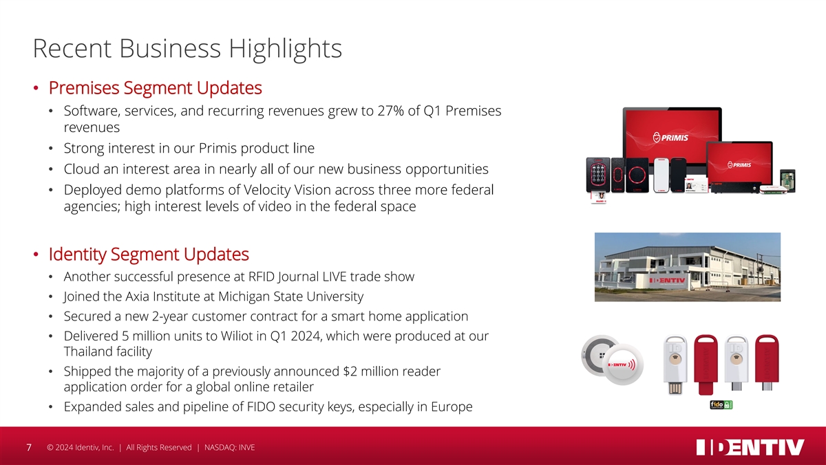 Introducing Kirsten Newquist, President, IoT Solutions • Ideal profile to lead the IoT Solutions business • 25+ years’ experience in strategy, product management, business development, and global sales and marketing • 17 years at Avery-Dennison Corporation, most recently Global Vice President, Avery Dennison Smartrac. Previously the VP/GM of Avery Dennison Medical • Joined Identiv on April 15, 2024 • To become CEO upon closing of Asset Sale transaction • Deeply understands the key customers and influencers Kirsten Newquist across the digital transformation of healthcare as well as President, IoT Solutions RFID operations • Pragmatic and disciplined businessperson © 2024 Identiv, Inc. | All Rights Reserved | NASDAQ: INVE 6