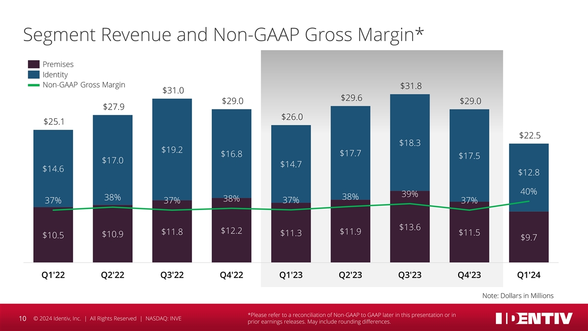 Financial Overview Metric Q1’24 Q4’23 Q1’23 Revenue $22.5M $29.0M $26.0M GAAP Gross Margin 37.3% 35.1% 35.4% Non-GAAP Gross Margin* 37.1% 39.9% 37.0% GAAP Operating Expenses $12.6M $11.8M $11.9M Non-GAAP Operating Expenses* $10.4M $9.8M $10.6M GAAP Net Loss** ($4.8M) ($1.9M) ($3.0M) EPS (GAAP) Diluted ($0.21) ($0.08) ($0.13) Non-GAAP Adj. EBITDA* ($1.4M) $0.9M ($0.9M) Non-GAAP Adj. EBITDA Margin* -6% 3% -4% *Please refer to a reconciliation of Non-GAAP to GAAP later in this presentation or in the Q1 2024 earnings release dated May 8, 2024. May include rounding differences. © 2024 Identiv, Inc. | All Rights Reserved | NASDAQ: INVE 9 **GAAP Net Loss available to common stockholders