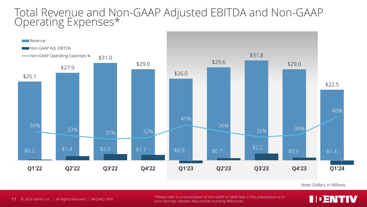 Segment Revenue and Non-GAAP Gross Margin* $31.8 $31.0 $29.6 $29.0 $29.0 $27.9 $26.0 $25.1 $22.5 $18.3 $19.2 $17.7 $16.8 $17.5 $17.0 $14.7 $14.6 $12.8 40% 39% 38% 38% 38% 37% 37% 37% 37% $13.6 $12.2 $11.8 $11.9 $11.5 $11.3 $10.9 $10.5 $9.7 Q1'22 Q2'22 Q3'22 Q4'22 Q1'23 Q2'23 Q3'23 Q4'23 Q1'24 Note: Dollars in Millions *Please refer to a reconciliation of Non-GAAP to GAAP later in this presentation or in © 2024 Identiv, Inc. | All Rights Reserved | NASDAQ: INVE 10 prior earnings releases. May include rounding differences.