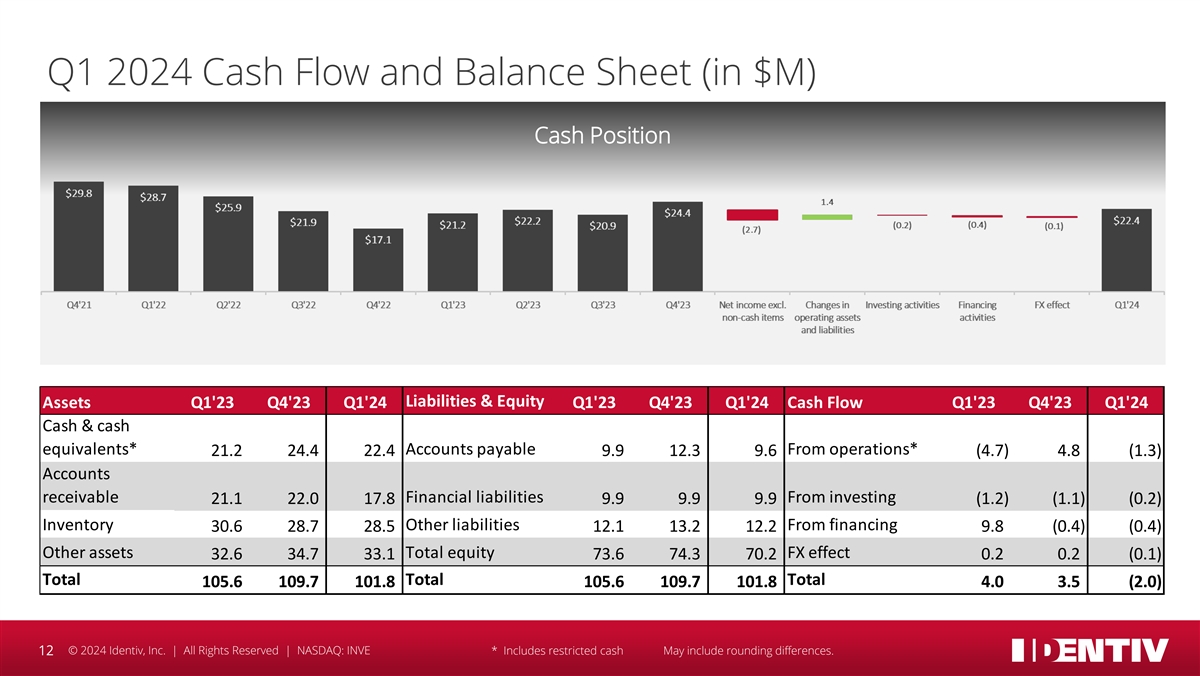 Total Revenue and Non-GAAP Adjusted EBITDA and Non-GAAP Operating Expenses* Revenue Non-GAAP Adj. EBITDA Non-GAAP Operating Expenses % $31.8 $31.0 $29.6 $29.0 $29.0 $27.9 $26.0 $25.1 $22.5 46% 41% 36% 36% 34% 33% 32% 32% 31% $2.2 $1.4 $2.0 $1.7 -$0.9 $0.2 $0.7 $0.9 -$1.4 Q1'22 Q2'22 Q3'22 Q4'22 Q1'23 Q2'23 Q3'23 Q4'23 Q1'24 Note: Dollars in Millions *Please refer to a reconciliation of Non-GAAP to GAAP later in this presentation or in © 2024 Identiv, Inc. | All Rights Reserved | NASDAQ: INVE 11 prior earnings releases. May include rounding differences.