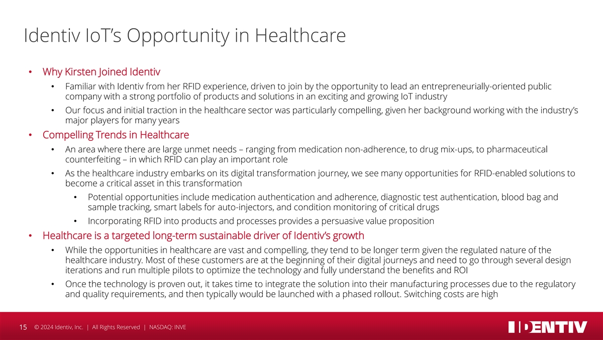 Post-Asset Sale Transaction Identiv IoT • The infusion of capital will fortify our balance sheet to support the growth of our specialty IoT business into what we expect to be a key player in the healthcare industry and other high-value end markets • Transforming industries takes time, particularly a regulated industry such as healthcare, and requires a clear go-to-market strategic plan, laser-focused execution, and investment with a deliberate allocation of resources • Singularly focused team led by Kirsten Newquist, who has a vision for strategic value creation and the path to get there from our current business position © 2024 Identiv, Inc. | All Rights Reserved | NASDAQ: INVE 14