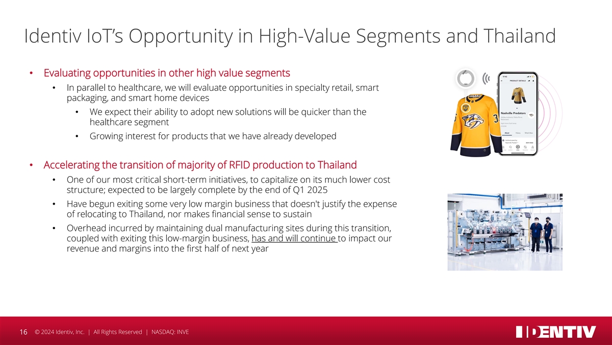 Identiv IoT’s Opportunity in Healthcare • Why Kirsten Joined Identiv • Familiar with Identiv from her RFID experience, driven to join by the opportunity to lead an entrepreneurially-oriented public company with a strong portfolio of products and solutions in an exciting and growing IoT industry • Our focus and initial traction in the healthcare sector was particularly compelling, given her background working with the industry’s major players for many years • Compelling Trends in Healthcare • An area where there are large unmet needs – ranging from medication non-adherence, to drug mix-ups, to pharmaceutical counterfeiting – in which RFID can play an important role • As the healthcare industry embarks on its digital transformation journey, we see many opportunities for RFID-enabled solutions to become a critical asset in this transformation • Potential opportunities include medication authentication and adherence, diagnostic test authentication, blood bag and sample tracking, smart labels for auto-injectors, and condition monitoring of critical drugs • Incorporating RFID into products and processes provides a persuasive value proposition • Healthcare is a targeted long-term sustainable driver of Identiv’s growth • While the opportunities in healthcare are vast and compelling, they tend to be longer term given the regulated nature of the healthcare industry. Most of these customers are at the beginning of their digital journeys and need to go through several design iterations and run multiple pilots to optimize the technology and fully understand the benefits and ROI • Once the technology is proven out, it takes time to integrate the solution into their manufacturing processes due to the regulatory and quality requirements, and then typically would be launched with a phased rollout. Switching costs are high © 2024 Identiv, Inc. | All Rights Reserved | NASDAQ: INVE 15
