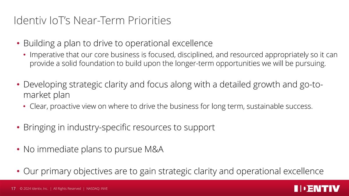 Identiv IoT’s Opportunity in High-Value Segments and Thailand • Evaluating opportunities in other high value segments • In parallel to healthcare, we will evaluate opportunities in specialty retail, smart packaging, and smart home devices • We expect their ability to adopt new solutions will be quicker than the healthcare segment • Growing interest for products that we have already developed • Accelerating the transition of majority of RFID production to Thailand • One of our most critical short-term initiatives, to capitalize on its much lower cost structure; expected to be largely complete by the end of Q1 2025 • Have begun exiting some very low margin business that doesn't justify the expense of relocating to Thailand, nor makes financial sense to sustain • Overhead incurred by maintaining dual manufacturing sites during this transition, coupled with exiting this low-margin business, has and will continue to impact our revenue and margins into the first half of next year © 2024 Identiv, Inc. | All Rights Reserved | NASDAQ: INVE 16