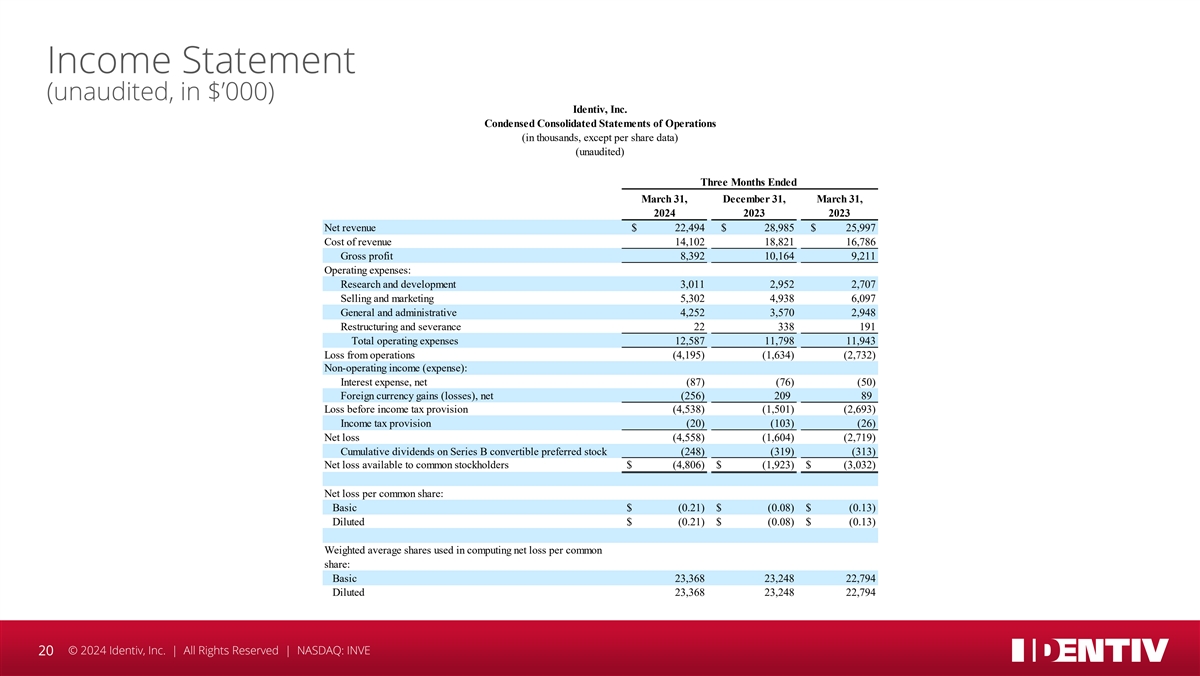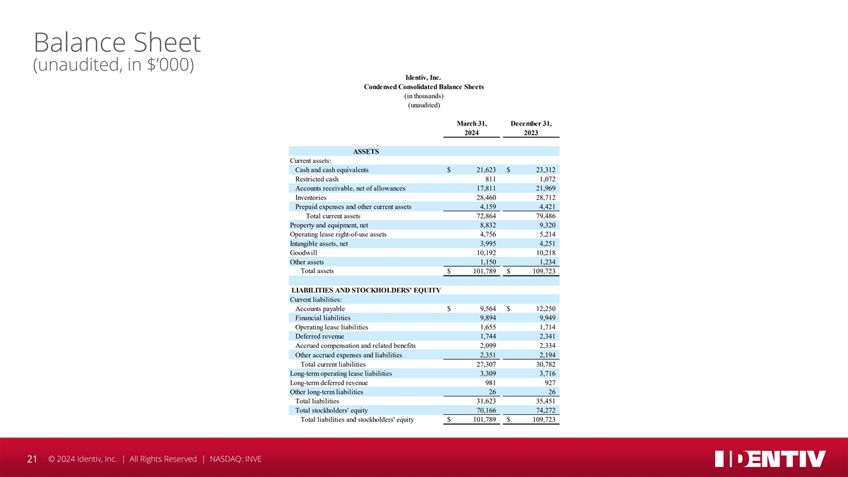 Income Statement (unaudited, in $’000) Identiv, Inc. Condensed Consolidated Statements of Operations (in thousands, except per share data) (unaudited) Three Months Ended March 31, December 31, March 31, 2024 2023 2023 Net revenue $ 22,494 $ 28,985 $ 25,997 Cost of revenue 14,102 18,821 16,786 Gross profit 8,392 10,164 9,211 Operating expenses: Research and development 3,011 2,952 2,707 Selling and marketing 5,302 4,938 6,097 General and administrative 4,252 3,570 2,948 Restructuring and severance 22 338 191 Total operating expenses 12,587 11,798 11,943 Loss from operations (4,195) (1,634) (2,732) Non-operating income (expense): Interest expense, net (87) (76) (50) Foreign currency gains (losses), net ( 256) 209 89 Loss before income tax provision (4,538) (1,501) (2,693) Income tax provision (20) (103) (26) Net loss (4,558) (1,604) (2,719) Cumulative dividends on Series B convertible preferred stock (248) (319) (313) Net loss available to common stockholders $ (4,806) $ (1,923) $ (3,032) Net loss per common share: Basic $ (0.21) $ (0.08) $ (0.13) Diluted $ (0.21) $ (0.08) $ (0.13) Weighted average shares used in computing net loss per common share: Basic 23,368 23,248 22,794 Diluted 23,368 23,248 22,794 © 2024 Identiv, Inc. | All Rights Reserved | NASDAQ: INVE 20
