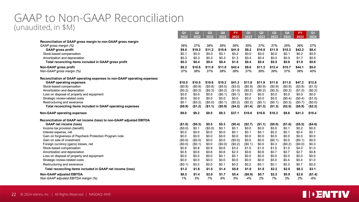 GAAP to Non-GAAP Reconciliation (unaudited, in $M) Q1 Q2 Q3 Q4 FY Q1 Q2 Q3 Q4 FY Q1 2022 2022 2022 2022 2022 2023 2023 2023 2023 2023 2024 Reconciliation of GAAP gross margin to non-GAAP gross margin GAAP gross margin (%) 36% 37% 36% 36% 36% 35% 37% 37% 35% 36% 37% GAAP gross profit $9.0 $10.2 $11.2 $10.6 $41.0 $9.2 $10.8 $11.9 $10.2 $42.2 $8.4 Stock-based compensation $0.1 $0.0 $0.0 $0.1 $0.2 $0.0 $0.0 $0.0 $0.1 $0.2 $0.0 Amortization and depreciation $0.3 $0.3 $0.3 $0.3 $1.3 $0.4 $0.4 $0.5 $0.5 $1.7 $0.5 Total reconciling items included in GAAP gross profit $0.3 $0.4 $0.4 $0.4 $1.5 $0.4 $0.4 $0.5 $0.6 $1.9 $0.6 Non-GAAP gross profit $9.3 $10.6 $11.6 $11.0 $42.4 $9.6 $11.3 $12.4 $10.7 $44.1 $9.0 Non-GAAP gross margin (%) 37% 38% 37% 38% 38% 37% 38% 39% 37% 38% 40% Reconciliation of GAAP operating expenses to non-GAAP operating expenses GAAP operating expenses $10.0 $10.5 $10.6 $10.2 $41.3 $11.9 $11.9 $11.6 $11.8 $47.2 $12.6 Stock-based compensation ($0.8) ($0.8) ($0.8) ($0.5) ($3.0) ($0.9) ($0.9) ($0.9) ($0.9) ($3.8) ($1.0) Amortization and depreciation ($0.2) ($0.2) ($0.3) ($0.2) ($1.0) ($0.2) ($0.2) ($0.3) ($0.2) ($1.0) ($0.2) Loss on disposal of property and equipment $0.0 $0.0 $0.0 ($0.1) ($0.1) $0.0 $0.0 $0.0 $0.0 $0.0 $0.0 Strategic review-related costs $0.0 $0.0 $0.0 $0.0 $0.0 $0.0 $0.0 $0.0 ($0.4) ($0.4) ($1.0) Restructuring and severance $0.1 ($0.2) ($0.0) ($0.1) ($0.2) ($0.2) ($0.1) ($0.1) ($0.3) ($0.7) ($0.0) Total reconciling items included in GAAP operating expenses ($0.9) ($1.2) ($1.1) ($0.9) ($4.2) ($1.4) ($1.3) ($1.3) ($2.0) ($5.9) ($2.2) Non-GAAP operating expenses $9.0 $9.2 $9.5 $9.3 $37.1 $10.6 $10.6 $10.3 $9.8 $41.3 $10.4 Reconciliation of GAAP net income (loss) to non-GAAP adjusted EBITDA GAAP net income (loss) ($1.0) ($0.3) $0.5 $0.3 ($0.4) ($2.7) ($1.1) ($0.0) ($1.6) ($5.5) ($4.6) Income tax provision (benefit) ($0.0) $0.1 ($0.0) $0.1 $0.1 $0.0 $0.0 $0.0 $0.1 $0.2 $0.0 Interest expense, net $0.0 $0.0 $0.0 $0.0 $0.1 $0.1 $0.1 $0.2 $0.1 $0.4 $0.1 Gain on forgiveness of Paycheck Protection Program note $0.0 $0.0 $0.0 $0.0 $0.0 $0.0 $0.0 $0.0 $0.0 $0.0 $0.0 Gain on sale of investment ($0.0) ($0.0) $0.0 $0.0 ($0.0) $0.0 $0.0 ($0.1) $0.0 ($0.1) $0.0 Foreign currency (gains) losses, net ($0.0) ($0.1) $0.0 ($0.0) ($0.2) ($0.1) $0.0 $0.3 ($0.2) ($0.0) $0.3 Stock-based compensation $0.9 $0.8 $0.9 $0.6 $3.2 $1.0 $1.0 $1.0 $1.0 $4.0 $1.0 Amortization and depreciation $0.5 $0.6 $0.6 $0.6 $2.3 $0.6 $0.6 $0.7 $0.7 $2.7 $0.8 Loss on disposal of property and equipment $0.0 $0.0 $0.0 $0.1 $0.1 $0.0 $0.0 $0.0 $0.0 $0.0 $0.0 Strategic review-related costs $0.0 $0.0 $0.0 $0.0 $0.0 $0.0 $0.0 $0.0 $0.4 $0.4 $1.0 Restructuring and severance ($0.1) $0.2 $0.0 $0.1 $0.2 $0.2 $0.1 $0.1 $0.3 $0.7 $0.0 Total reconciling items included in GAAP net income (loss) $1.2 $1.6 $1.5 $1.4 $5.8 $1.8 $1.8 $2.2 $2.5 $8.3 $3.1 Non-GAAP adjusted EBITDA $0.2 $1.4 $2.0 $1.7 $5.4 ($0.9) $0.7 $2.2 $0.9 $2.8 ($1.4) Non-GAAP adjusted EBITDA margin (%) 1% 5% 7% 6% 5% -4% 2% 7% 3% 2% -6% © 2024 Identiv, Inc. | All Rights Reserved | NASDAQ: INVE 22