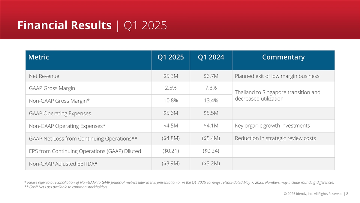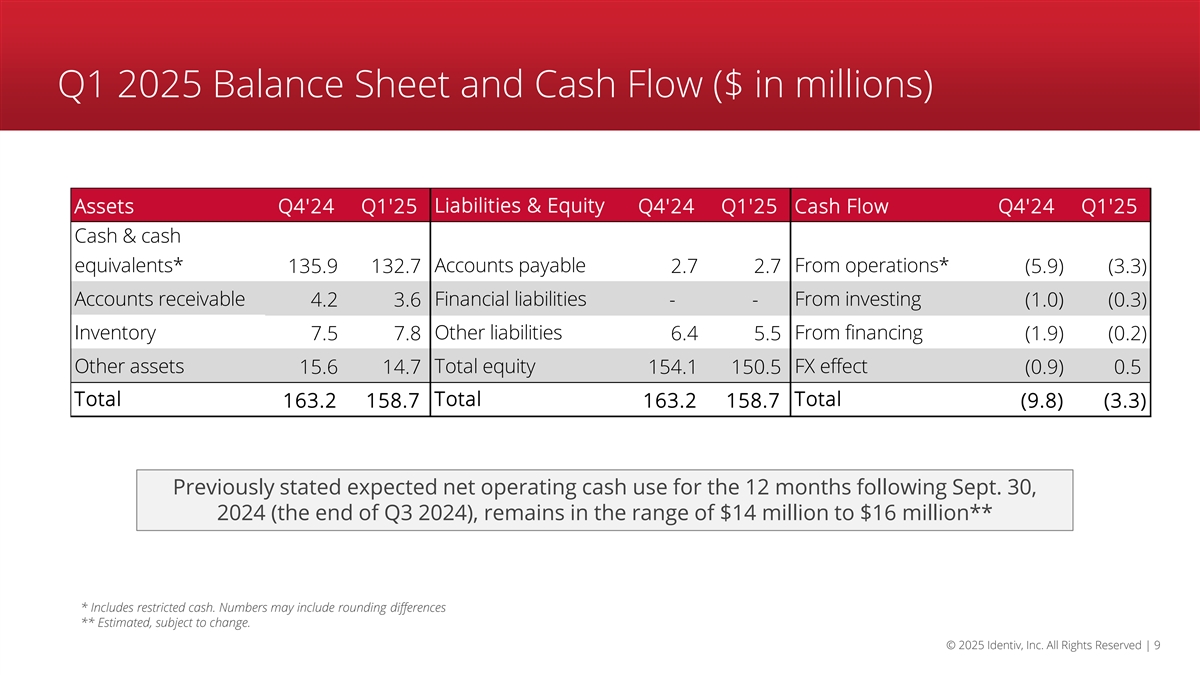 Financial Results | Q1 2025 Metric Q1 2025 Q1 2024 Commentary Net Revenue $5.3M $6.7M Planned exit of low margin business 2.5% 7.3% GAAP Gross Margin Thailand to Singapore transition and decreased utilization 10.8% 13.4% Non-GAAP Gross Margin* $5.6M $5.5M GAAP Operating Expenses $4.5M $4.1M Key organic growth investments Non-GAAP Operating Expenses* ($4.8M) ($5.4M) Reduction in strategic review costs GAAP Net Loss from Continuing Operations** ($0.21) ($0.24) EPS from Continuing Operations (GAAP) Diluted ($3.9M) ($3.2M) Non-GAAP Adjusted EBITDA* * Please refer to a reconciliation of Non-GAAP to GAAP financial metrics later in this presentation or in the Q1 2025 earnings release dated May 7, 2025. Numbers may include rounding differences. ** GAAP Net Loss available to common stockholders © 2025 Identiv, Inc. All Rights Reserved | 8