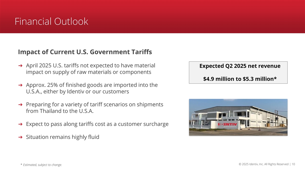 Q1 2025 Balance Sheet and Cash Flow ($ in millions) Assets Q4'24 Q1'25 Liabilities & Equity Q4'24 Q1'25 Cash Flow Q4'24 Q1'25 Cash & cash equivalents* 135.9 132.7 Accounts payable 2.7 2.7 From operations* (5.9) (3.3) Accounts receivable Financial liabilities From investing 4.2 3.6 - - (1.0) (0.3) Inventory Other liabilities From financing 7.5 7.8 6.4 5.5 (1.9) (0.2) Other assets Total equity FX effect 15.6 14.7 154.1 150.5 (0.9) 0.5 Total Total Total 163.2 158.7 163.2 158.7 (9.8) (3.3) Previously stated expected net operating cash use for the 12 months following Sept. 30, 2024 (the end of Q3 2024), remains in the range of $14 million to $16 million** * Includes restricted cash. Numbers may include rounding differences ** Estimated, subject to change. © 2025 Identiv, Inc. All Rights Reserved | 9