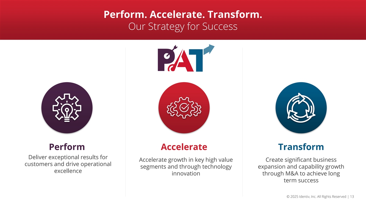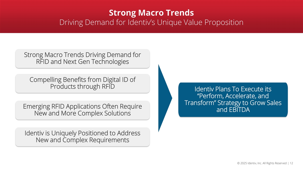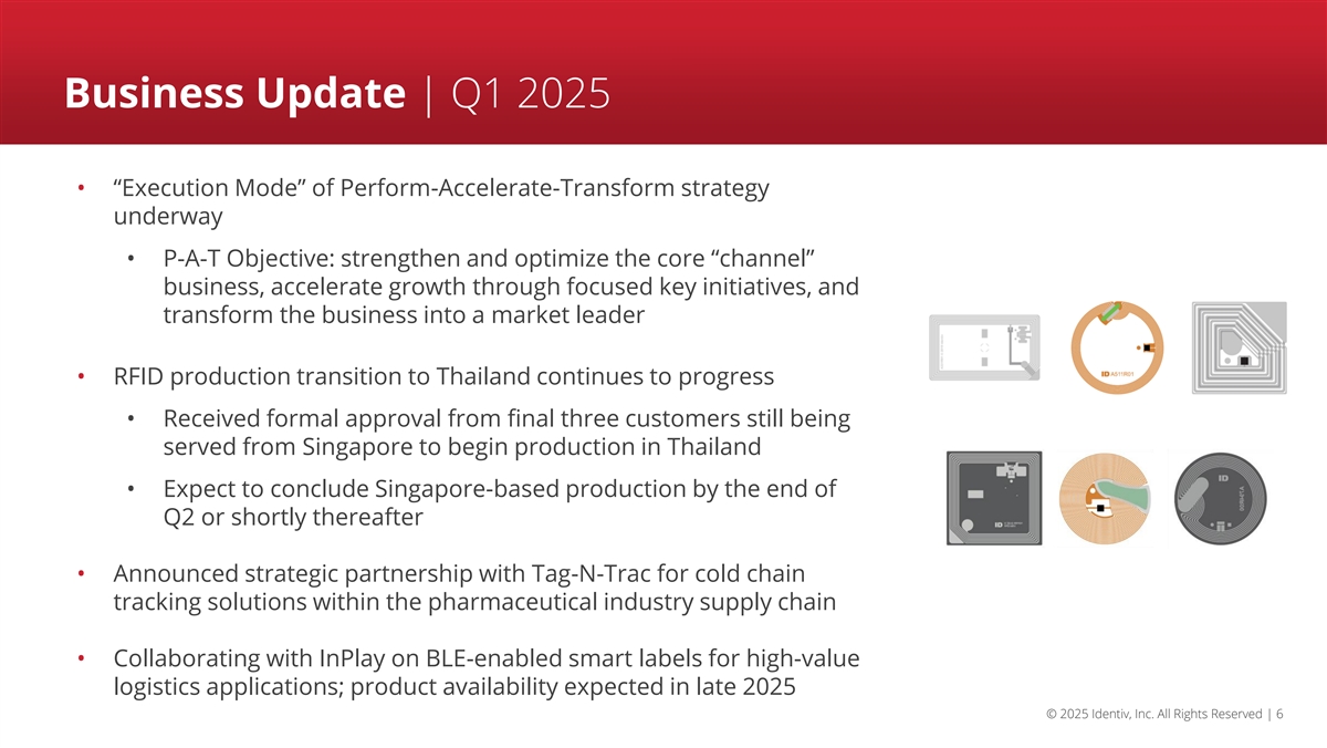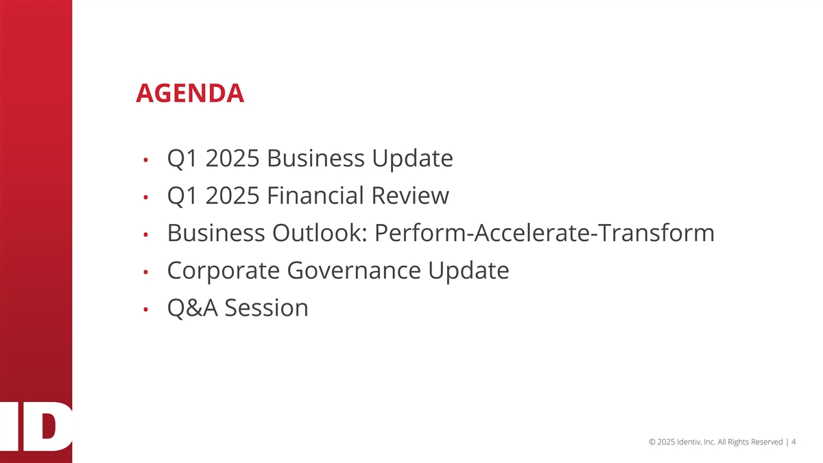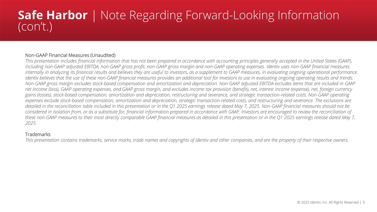 Safe Harbor | Note Regarding Forward-Looking Information This presentation contains forward-looking statements within the meaning of the Private Securities Litigation Reform Act of 1995. Forward-looking statements are those involving future events and future results that are based on current expectations as well as the current beliefs and assumptions of management of Identiv and can be identified by words such as “anticipate,” “believe,” “continue,” “plan,” “will,” “intend,” “expect,” “outlook,” and similar references to the future. Any statement that is not a historical fact is a forward-looking statement, including statements regarding: Identiv’s expectations regarding future operating and financial outlook and performance; expected 2025 first quarter outlook, including expected revenue; Identiv’s strategy, opportunities, focus and goals; opportunities in the market and industry in which Identiv operates; Identiv’s plans to transition its RFID production to Thailand, including expected timing thereof; Identiv’s beliefs regarding its new strategic partnerships and product development pipeline; Identiv’s belief that it is well-positioned to leverage upcoming opportunities; Identiv’s expectations for its “Perform, Accelerate, and Transform” strategic framework, including its goal to deliver exceptional results for customers and drive operational excellence, accelerate growth in key high value segments and through technology innovation, and create significant business expansion and capability growth through M&A to achieve long term success, and the goals and benefits thereof; Identiv’s beliefs that it has ample financial resources to support the execution of P-A-T strategy, positioning it to drive meaningful returns and enhance shareholder value; Identiv’s plans to track and report P-A-T progress on a quarterly basis, and develop its baseline and establish targets for sales pipeline, new product development projects and new product development project completion metrics in 2026; Identiv’s growth initiatives; evaluation of potential M&A opportunities, and the expected benefits of potential M&A; expected macroeconomic trends in driving demand for RFID and next-generation technologies and the benefits thereof; Identiv’s expectations regarding the impact of global macroeconomic conditions, including tariffs; Identiv’s expectations regarding potential mitigation strategies in response to tariffs; Identiv’s solicitation of stockholder approval to declassify the Board of Directors and the anticipated effectiveness thereof; Identiv’s beliefs regarding its corporate governance practices; and Identiv’s expectations with respect to demand and customer orders. Forward-looking statements are only predictions and are subject to a number of risks and uncertainties, many of which are outside Identiv’s control, which could cause actual results to differ materially and adversely from those expressed in any forward-looking statements. Factors that could cause actual results to differ materially from those in the forward-looking statements include, but are not limited to: the failure of the proposed declassification of the Board of Directors to become effective, whether due to a lack of stockholder approval or for any other reason; any changes to M&A investment criteria, difficulty in finding a viable M&A candidate or executing a transaction and the effect of such changes and difficulty on Identiv’s future performance; Identiv’s ability to successfully execute its business strategy, including, but not limited to, organic and inorganic growth; strategic partnerships and product development; delays in transitioning RFID production to Thailand; changes in uses of capital; Identiv’s ability to capitalize on trends in its business and penetrate the healthcare and other specialty markets; the effect of competition on Identiv’s business; Identiv’s ability to satisfy customer demand and expectations; the level and timing of customer orders and changes/cancellations; the loss of customers, suppliers or partners; the success of Identiv’s products and strategic partnerships; industry trends and seasonality; the impact of macroeconomic conditions and customer demand, inflation and increases in prices; the impact of tariffs on its business and the other factors discussed in its periodic reports, including its Annual Report on Form 10-K for the year ended December 31, 2024, and subsequent reports filed with the SEC. All forward-looking statements are based on information available to Identiv on the date hereof, and Identiv assumes no obligation to update such statements. © 2025 Identiv, Inc. All Rights Reserved | 2