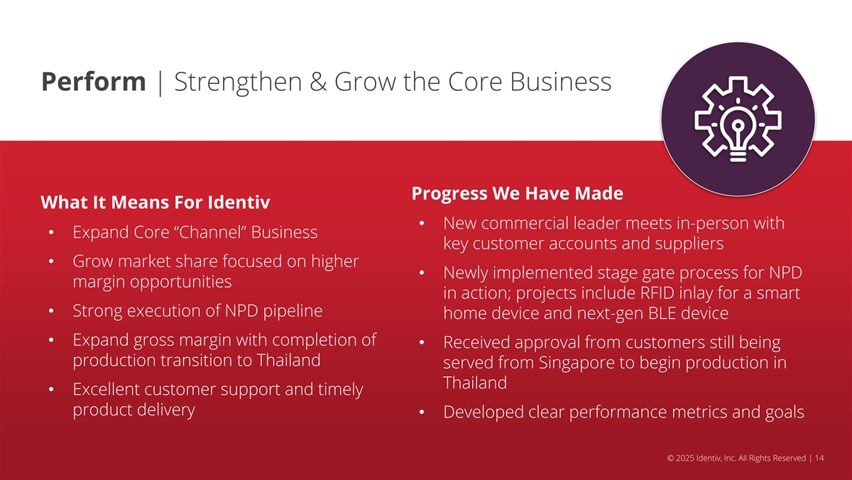 Perform. Accelerate. Transform. Our Strategy for Success Perform Accelerate Transform Deliver exceptional results for Accelerate growth in key high value Create significant business customers and drive operational segments and through technology expansion and capability growth excellence innovation through M&A to achieve long term success © 2025 Identiv, Inc. All Rights Reserved | 13