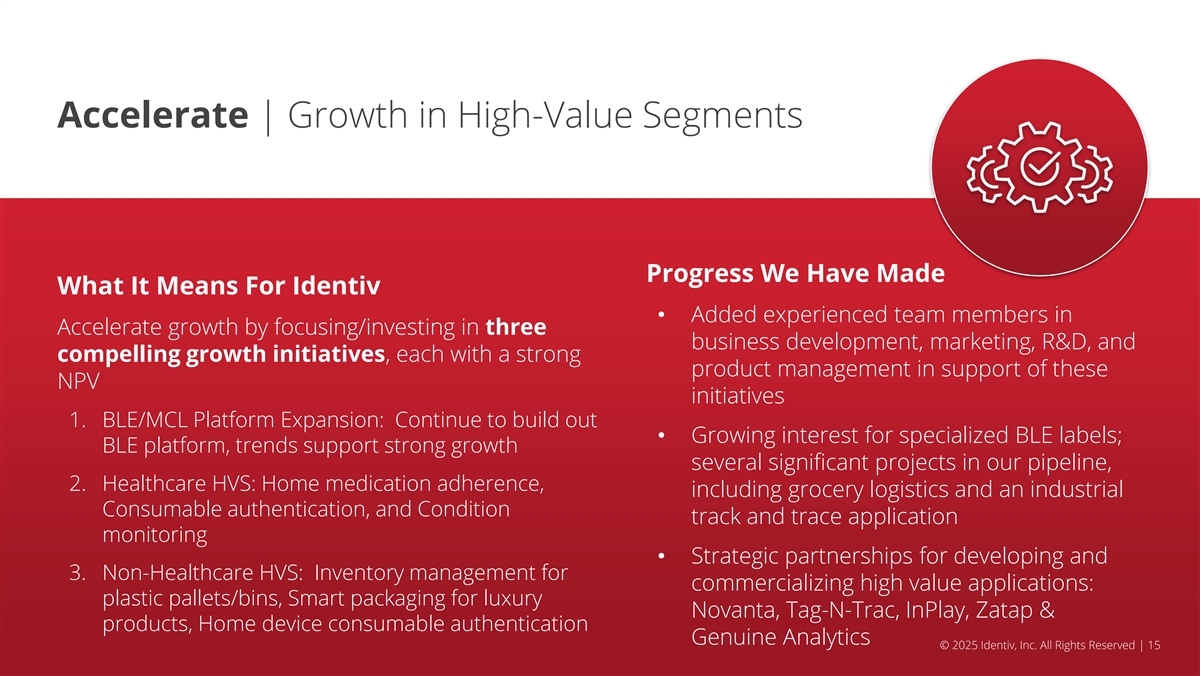 Perform | Strengthen & Grow the Core Business Progress We Have Made What It Means For Identiv • New commercial leader meets in-person with • Expand Core “Channel” Business key customer accounts and suppliers • Grow market share focused on higher • Newly implemented stage gate process for NPD margin opportunities in action; projects include RFID inlay for a smart • Strong execution of NPD pipeline home device and next-gen BLE device • Expand gross margin with completion of • Received approval from customers still being production transition to Thailand served from Singapore to begin production in Thailand • Excellent customer support and timely product delivery • Developed clear performance metrics and goals © 2025 Identiv, Inc. All Rights Reserved | 14