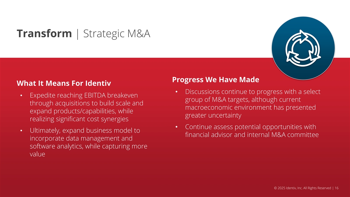 Accelerate | Growth in High-Value Segments Progress We Have Made What It Means For Identiv • Added experienced team members in Accelerate growth by focusing/investing in three business development, marketing, R&D, and compelling growth initiatives, each with a strong product management in support of these NPV initiatives 1. BLE/MCL Platform Expansion: Continue to build out • Growing interest for specialized BLE labels; BLE platform, trends support strong growth several significant projects in our pipeline, 2. Healthcare HVS: Home medication adherence, including grocery logistics and an industrial Consumable authentication, and Condition track and trace application monitoring • Strategic partnerships for developing and 3. Non-Healthcare HVS: Inventory management for commercializing high value applications: plastic pallets/bins, Smart packaging for luxury Novanta, Tag-N-Trac, InPlay, Zatap & products, Home device consumable authentication Genuine Analytics © 2025 Identiv, Inc. All Rights Reserved | 15