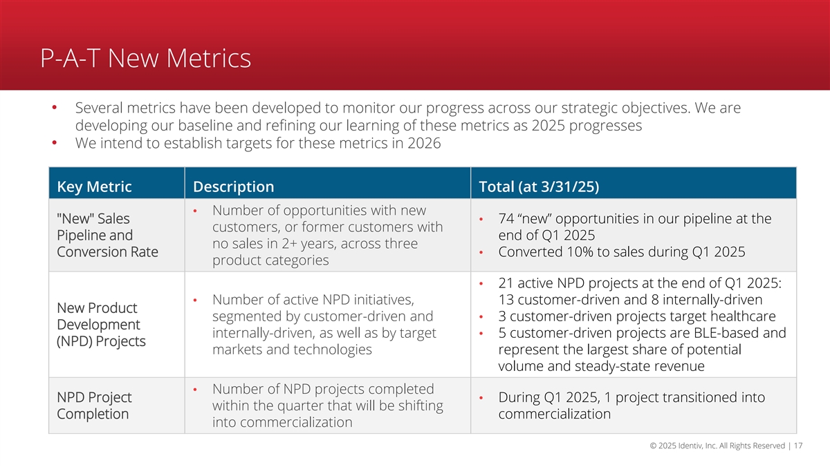 P-A-T New Metrics • Several metrics have been developed to monitor our progress across our strategic objectives. We are developing our baseline and refining our learning of these metrics as 2025 progresses • We intend to establish targets for these metrics in 2026 Key Metric Description Total (at 3/31/25) • Number of opportunities with new New Sales • 74 “new” opportunities in our pipeline at the customers, or former customers with Pipeline and end of Q1 2025 no sales in 2+ years, across three Conversion Rate• Converted 10% to sales during Q1 2025 product categories • 21 active NPD projects at the end of Q1 2025: • Number of active NPD initiatives, 13 customer-driven and 8 internally-driven New Product segmented by customer-driven and • 3 customer-driven projects target healthcare Development internally-driven, as well as by target • 5 customer-driven projects are BLE-based and (NPD) Projects markets and technologies represent the largest share of potential volume and steady-state revenue • Number of NPD projects completed NPD Project • During Q1 2025, 1 project transitioned into within the quarter that will be shifting Completion commercialization into commercialization © 2025 Identiv, Inc. All Rights Reserved | 17