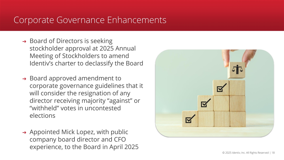 Corporate Governance Enhancements ➔ Board of Directors is seeking stockholder approval at 2025 Annual Meeting of Stockholders to amend Identiv’s charter to declassify the Board ➔ Board approved amendment to corporate governance guidelines that it will consider the resignation of any director receiving majority “against” or “withheld” votes in uncontested elections ➔ Appointed Mick Lopez, with public company board director and CFO experience, to the Board in April 2025 © 2025 Identiv, Inc. All Rights Reserved | 18