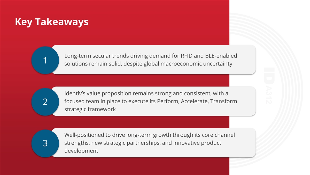 Key Takeaways Long-term secular trends driving demand for RFID and BLE-enabled 1 solutions remain solid, despite global macroeconomic uncertainty Identiv’s value proposition remains strong and consistent, with a focused team in place to execute its Perform, Accelerate, Transform 2 strategic framework Well-positioned to drive long-term growth through its core channel strengths, new strategic partnerships, and innovative product 3 development