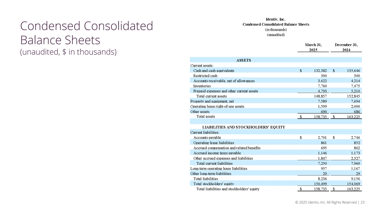 Condensed Consolidated Statements of Operations (unaudited, $ in thousands) © 2025 Identiv, Inc. All Rights Reserved | 22