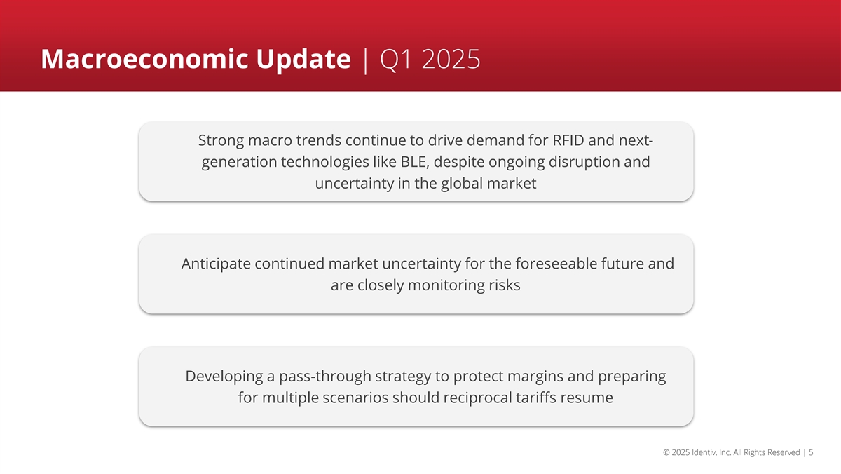 AGENDA • Q1 2025 Business Update • Q1 2025 Financial Review • Business Outlook: Perform-Accelerate-Transform • Corporate Governance Update • Q&A Session © 2025 Identiv, Inc. All Rights Reserved | 4