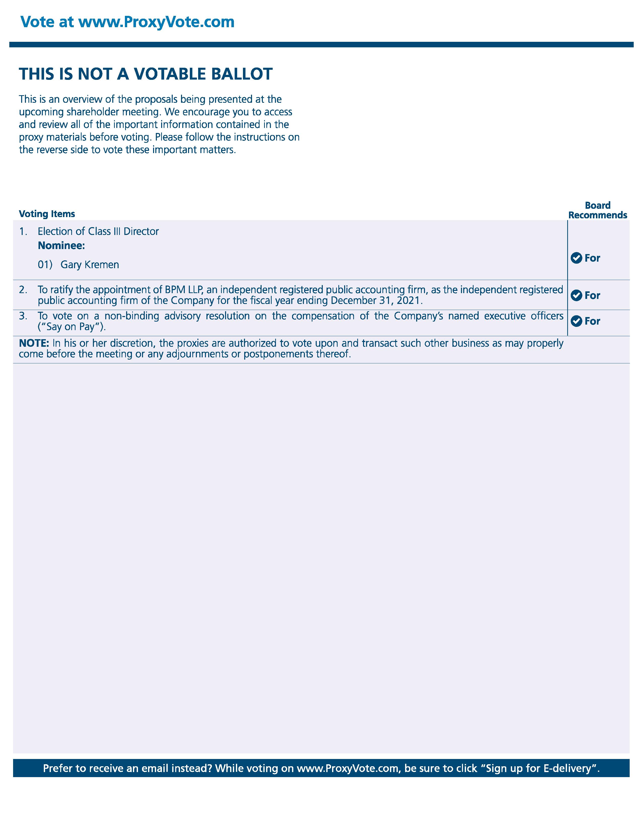 Voting Items Board Recommends 01) Gary Kremen 1. Election of Class III Director Nominee: 2. To ratify the appointment of BPM LLP, an independent registered public accounting firm, as the independent registered public accounting firm of the Company for the fiscal year ending December 31, 2021.